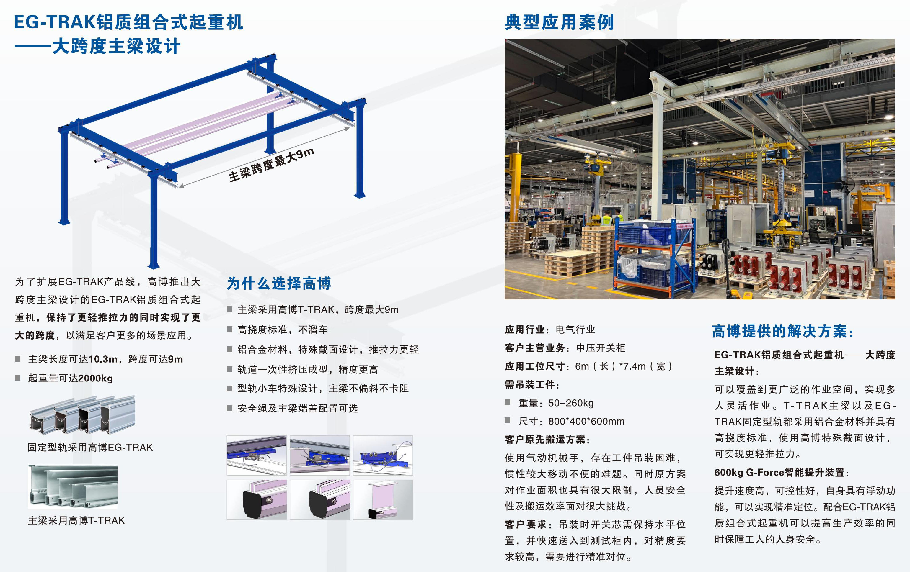 為了擴(kuò)展EG-TRAK產(chǎn)品線,高博推出大跨度主梁設(shè)計(jì)的EG-TRAK鋁質(zhì)組合式起重機(jī),保持了更輕推拉力的同時(shí)實(shí)現(xiàn)了更大的跨度,以滿足客戶更多的場(chǎng)景應(yīng)用。